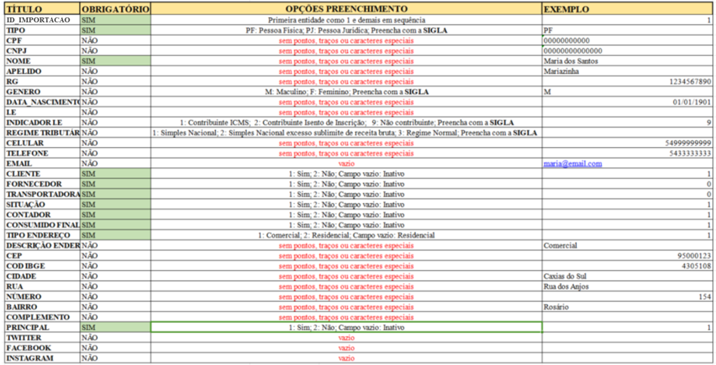 - Os campos em verde da planilha são obrigatórios para sucesso na importação;