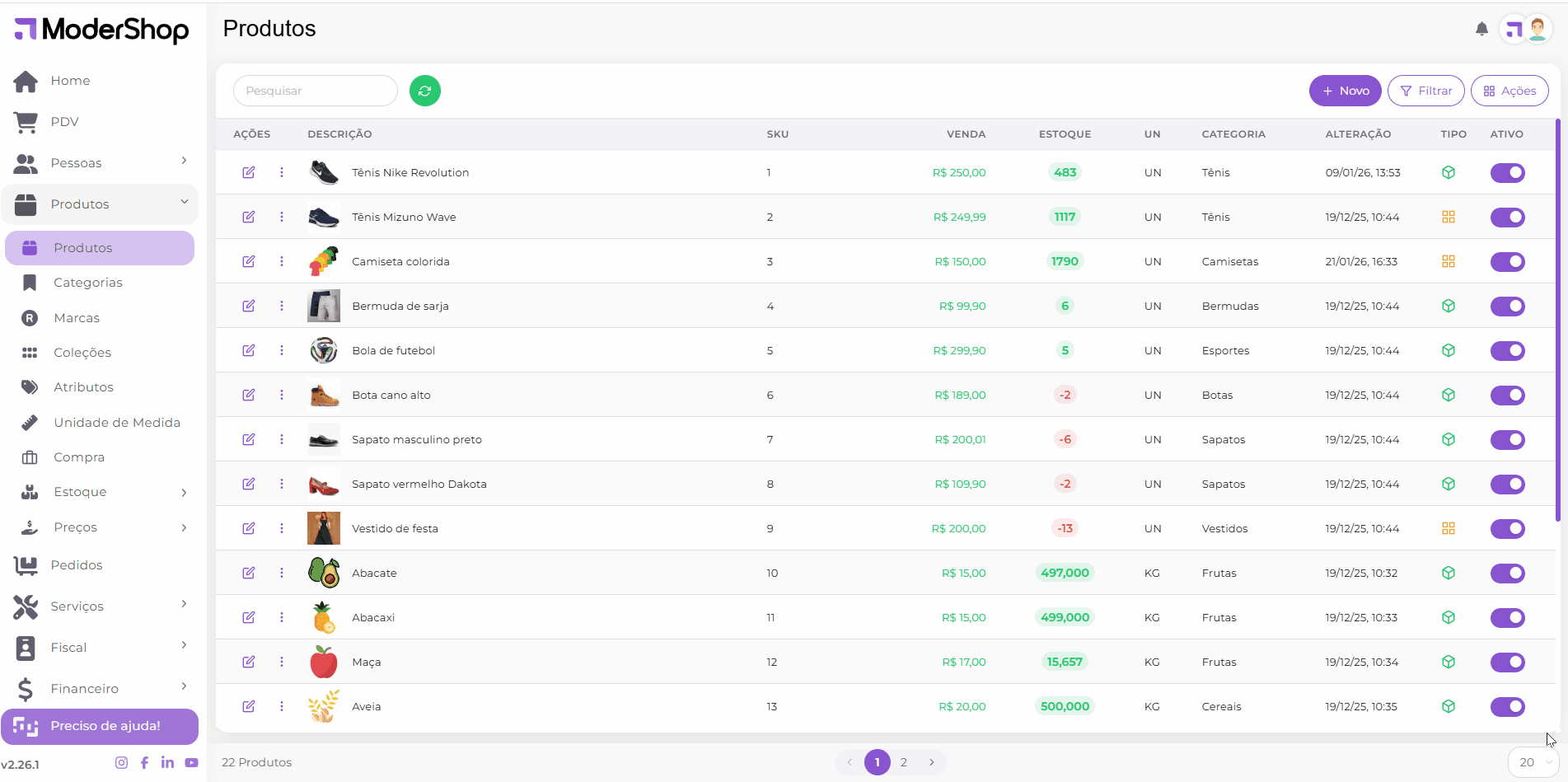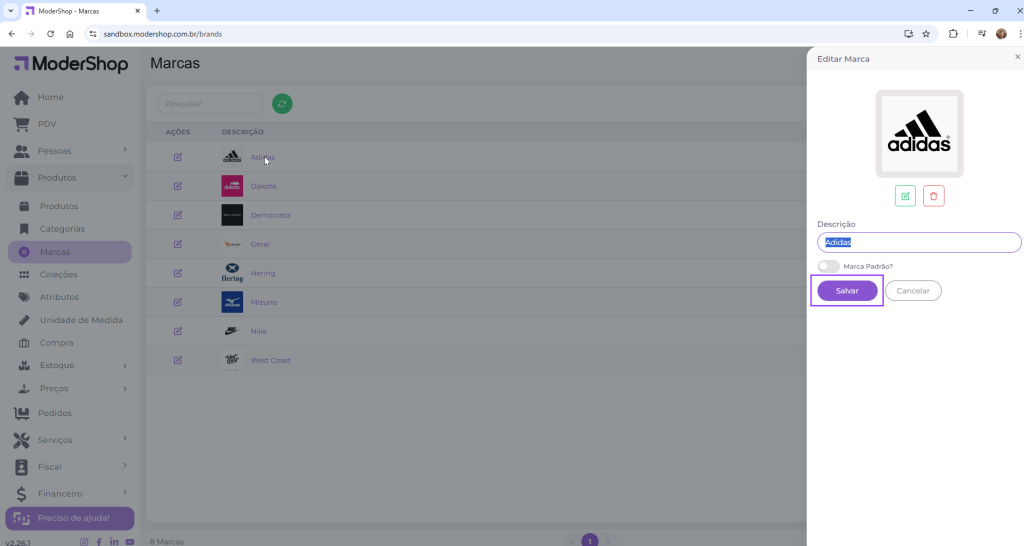 Nesta tela, constará todas as marcas que estão cadastradas no seu sistema, onde é possível cadastrar e editar as informações de marcas já cadastradas.