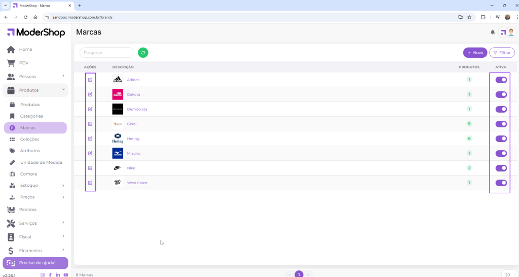 Caso precise, é possível editar as informações ou inativar as marcas. Basta clicar sobre o botão da ação que deseja realizar, sendo o ícone de lápis para edição e a caixa de ativação para ativar ou inativar, e a mesma será feita.