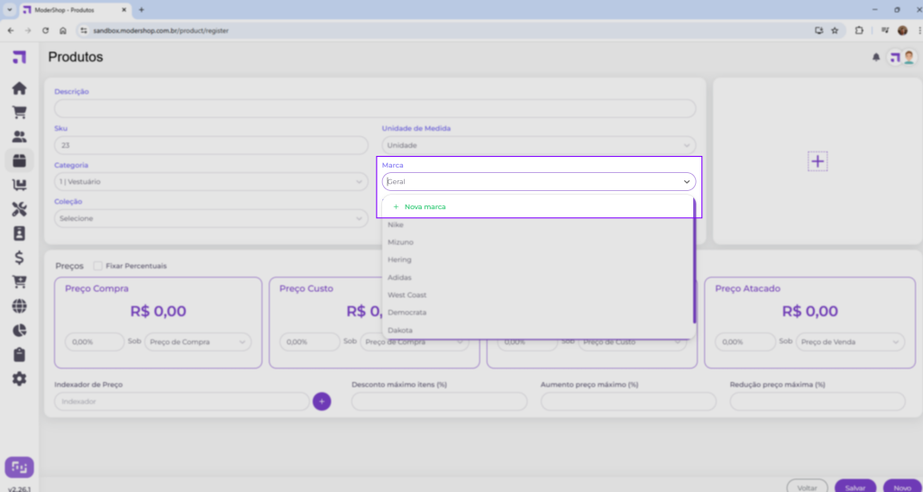 Após clicar no botão, aparecerá no canto direito uma tela para cadastro, onde você poderá informar uma imagem para a marca e informar sua descrição. Com estes informados, basta clicar em “Salvar” para que a nova marca seja salva. A opção de “padrão” fará com que a marca sempre seja “pré-selecionada” ao cadastrar um novo produto.