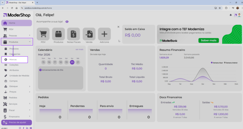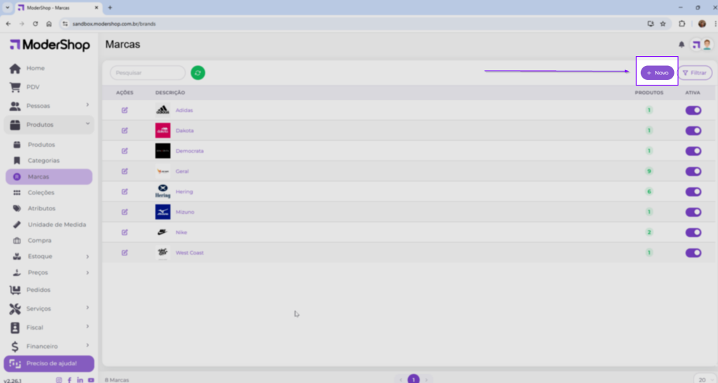 Para que você possa cadastrar novas marcas e possa verificar quais já estão dentro do seu sistema, você irá clicar no menu “Produtos” e clicar no submenu “Marcas”.