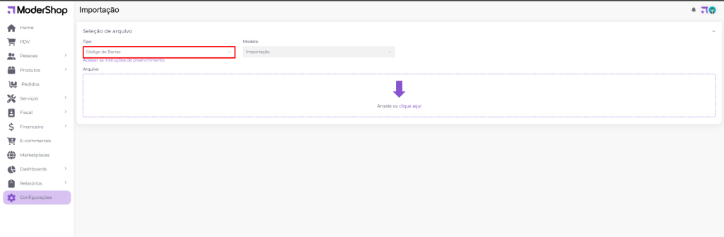 .csv(separado por ponto e vírgula;). - Acesse o ModerShop, vá até o módulo Importação de Dados.