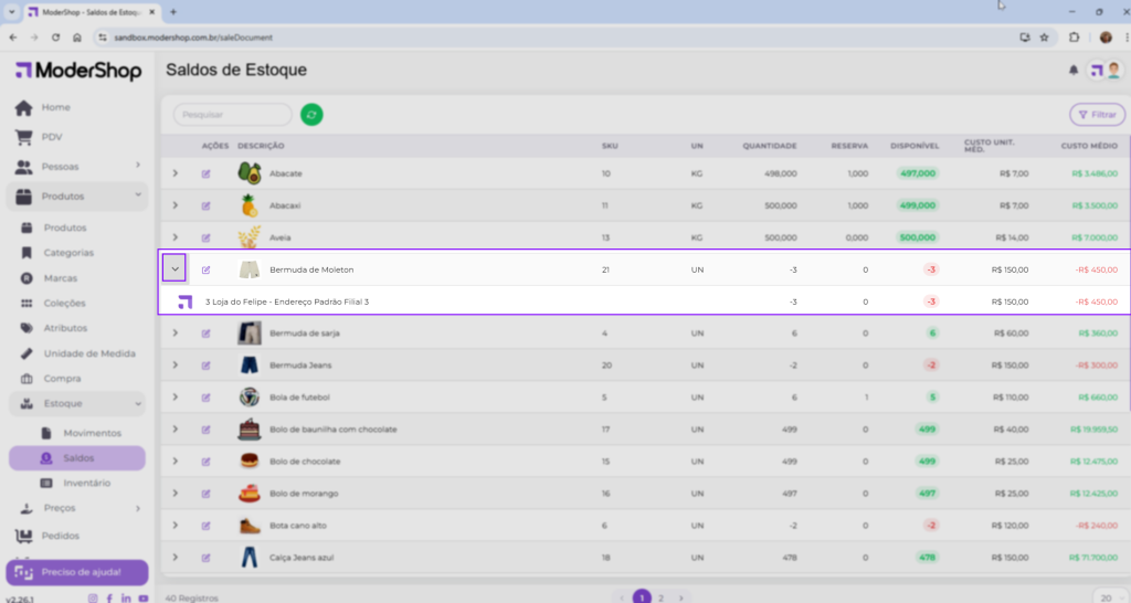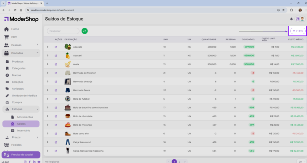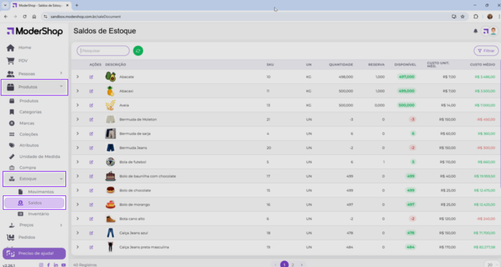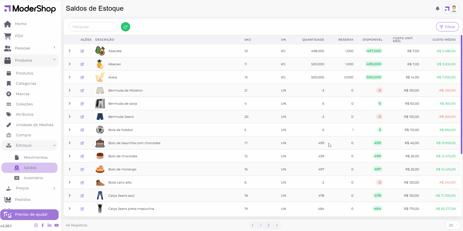 - Disponível: valor de estoque que está disponível para venda (quantidade total – quantidade reservada)