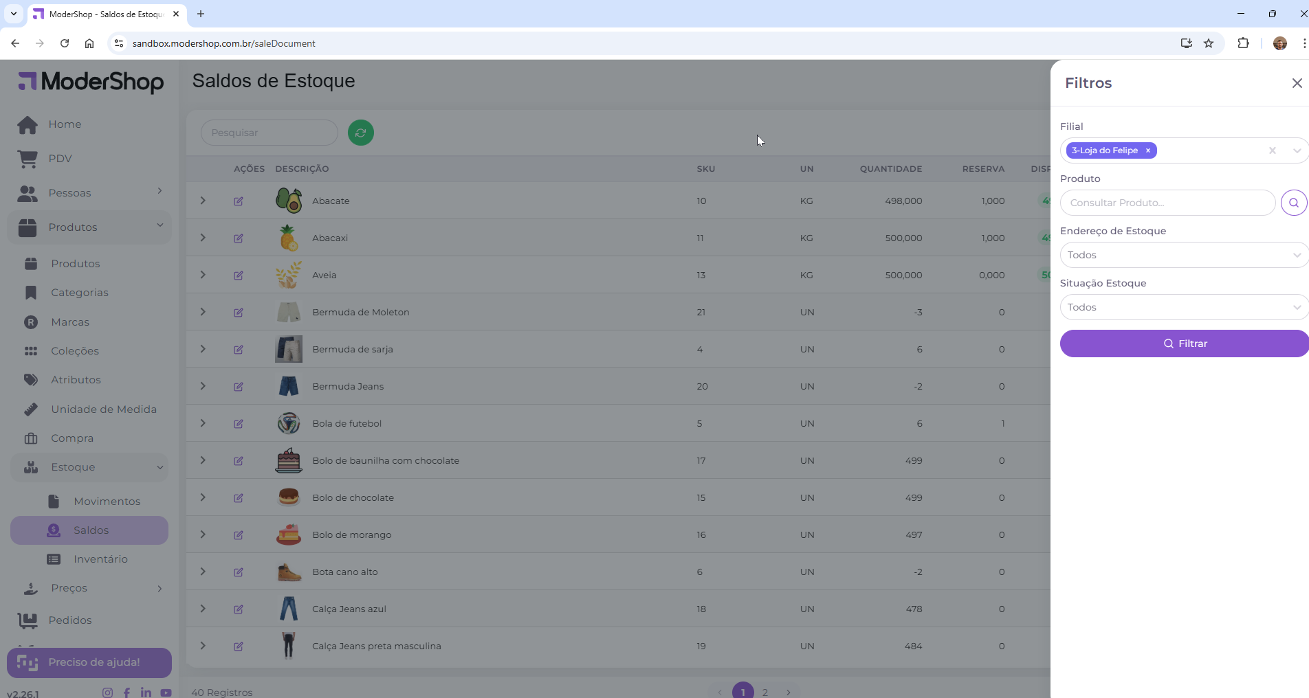 A visualização de saldos de estoque permite ao usuários verificar as quantidades de estoque dos produtos, quantidade reservada e valor estimado em estoque.