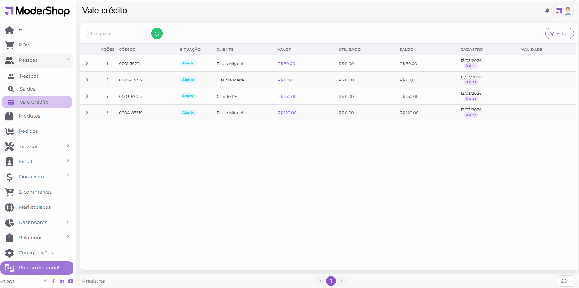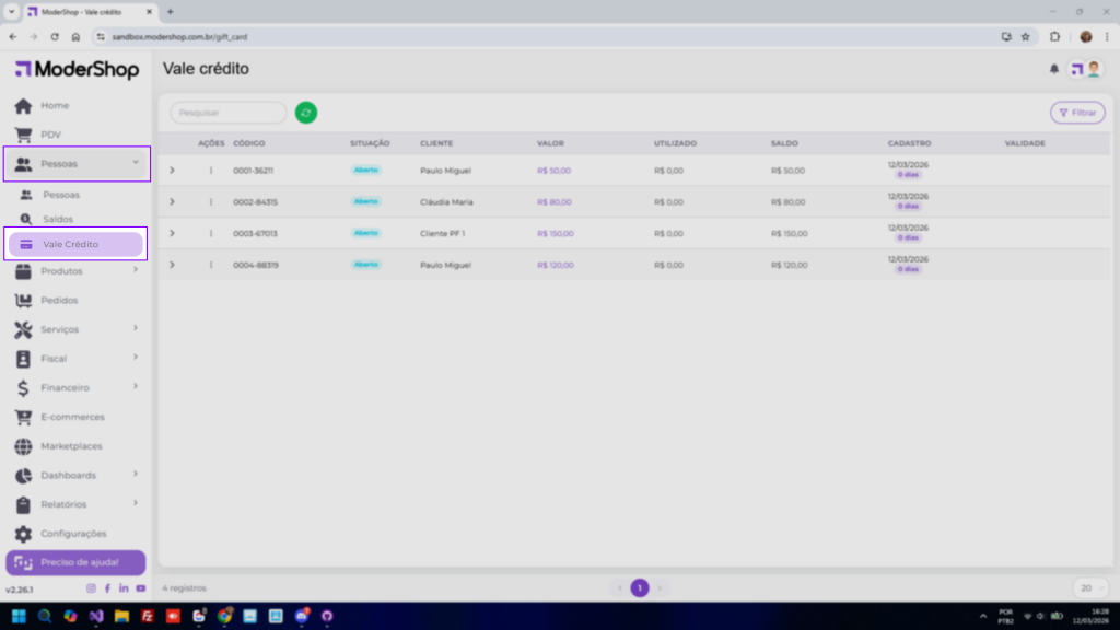 Saia do PDV e vá até Pessoas > Vale Crédito.